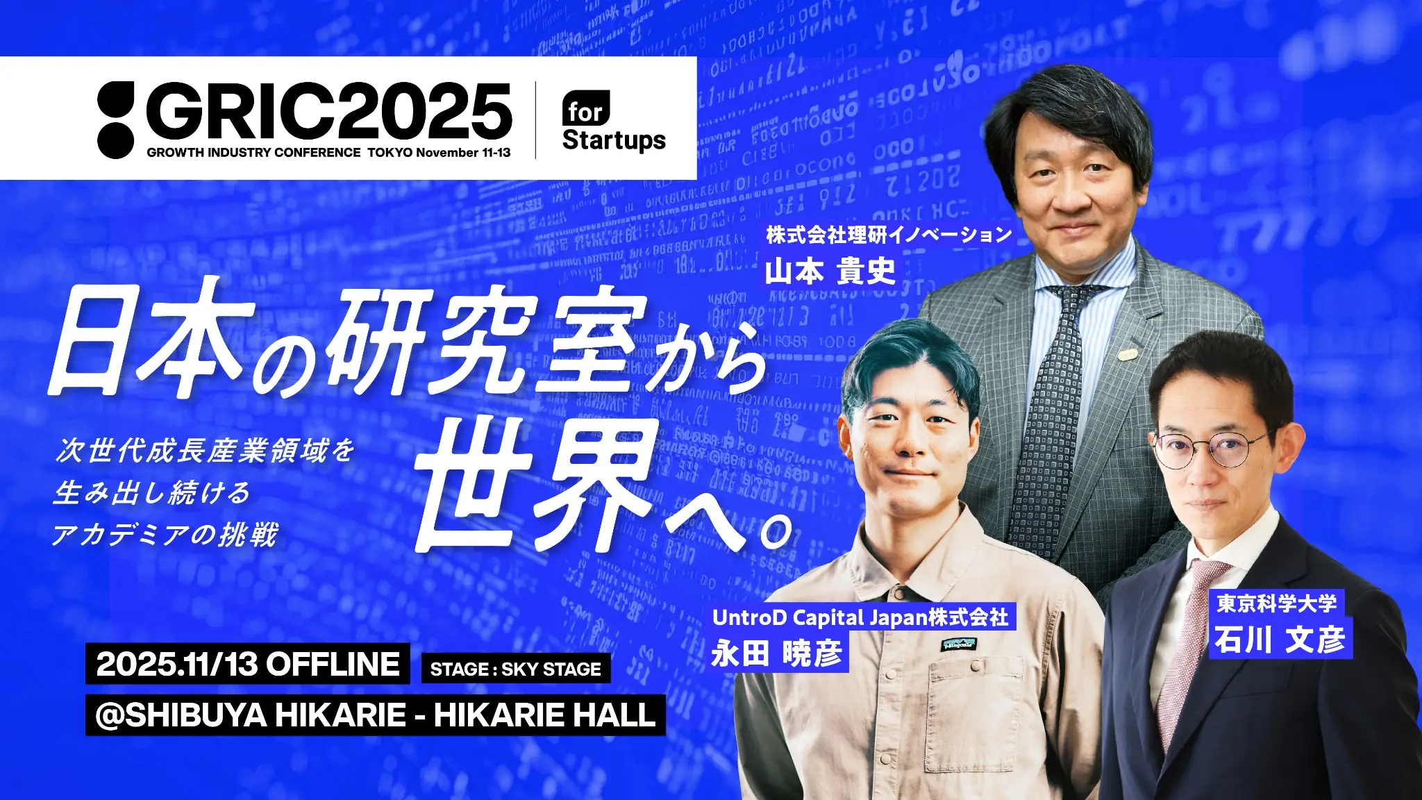 Deep Tech investment by VCs has increased tenfold over the past decade, now accounting for 30% of companies with a market capitalization of over 100 billion yen in the growth market. AI, Bio, Space, Quantum—Japan's next growth engine undoubtedly lies dormant within Academia (universities and research institutions). The question is: How can world-class research achievements be successfully converted into businesses that can win globally, continuously generating the next wave of growth industries? This session brings together an unparalleled lineup on the front lines of this grand and urgent challenge. The session will be moderated by Mr. Nagata of UntroD, a leader in Deep Tech investment across Japan and Asia. The speakers include Professor Ishikawa of the Institute of Science Tokyo (Tokyo Tech & TMDU), Japan's most powerful comprehensive science university—newly established in 2024 through the merger of Tokyo Institute of Technology and Tokyo Medical and Dental University—who spearheads the social implementation of world-class research. He is joined by Mr. Yamamoto, who has been at the forefront of the social implementation of Japanese science and technology for over 20 years as the TLO (Technology Licensing Office) head at the University of Tokyo and RIKEN. These professionals will explore the potential and reality of Deep Tech that will shape Japan's future.